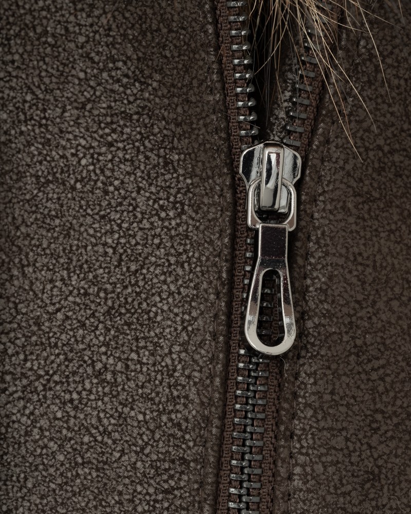 Dámsky kožuch Jaśmin vyniká nádherným klopovým golierom, ktorý bol – rovnako ako manžety rukávov – lemovaný jazvecom, čo vytvára spektakulárny vizuálny efekt. Jemne prispôsobený strih výborne zvýrazňuje ženskú postavu a dodáva majiteľke sebadôveru v každej situácii. Kožuch sa zapína na obojstranný zips, vyrobený z nehrdzavejúcej ocele. Na voľné nastavenie obvodu slúži opasok v spodnej časti, vďaka ktorému si dokonale prispôsobíte model svojej postave. Celok skvele dopĺňajú dva ozdobné pásiky prítomné pri manžetách.