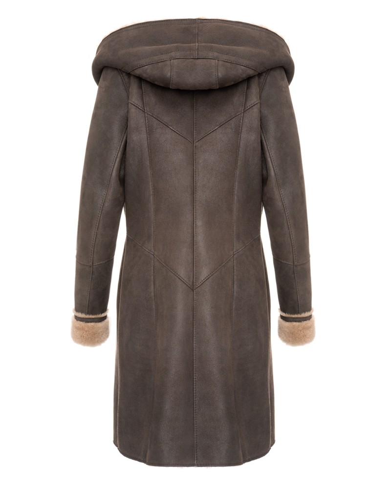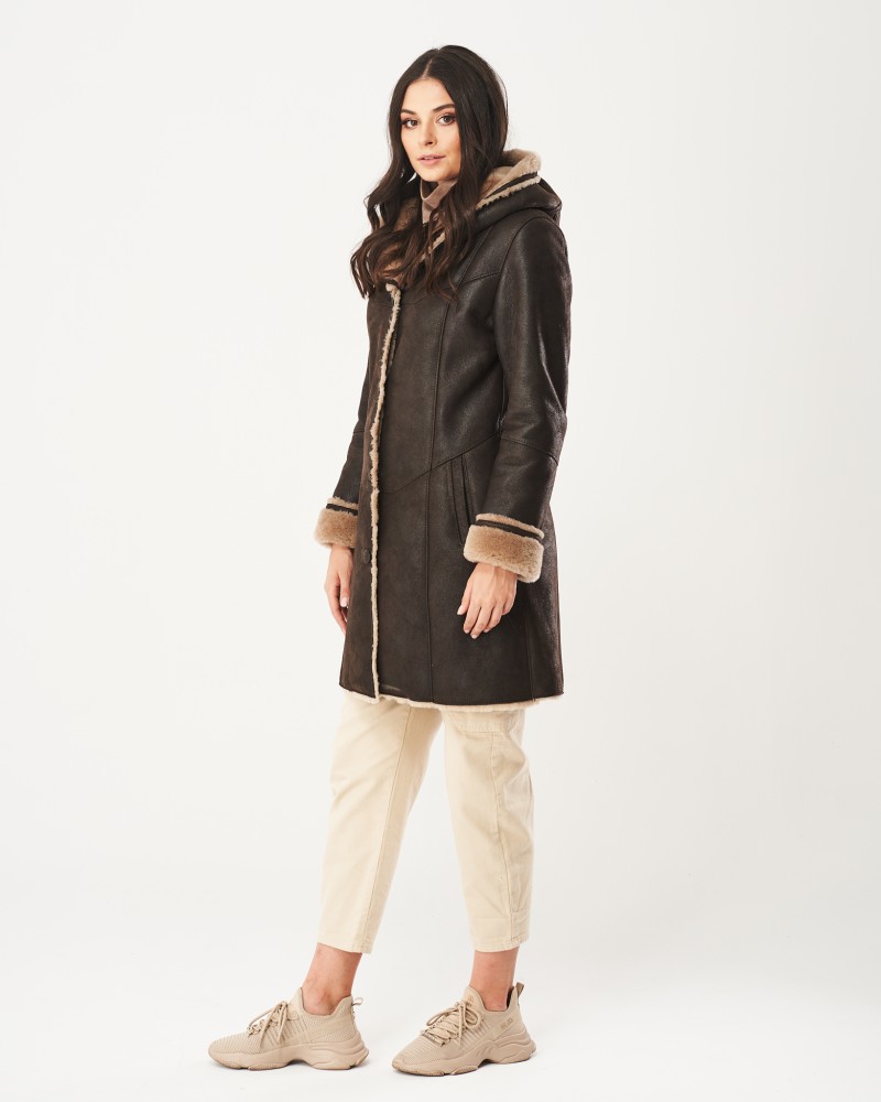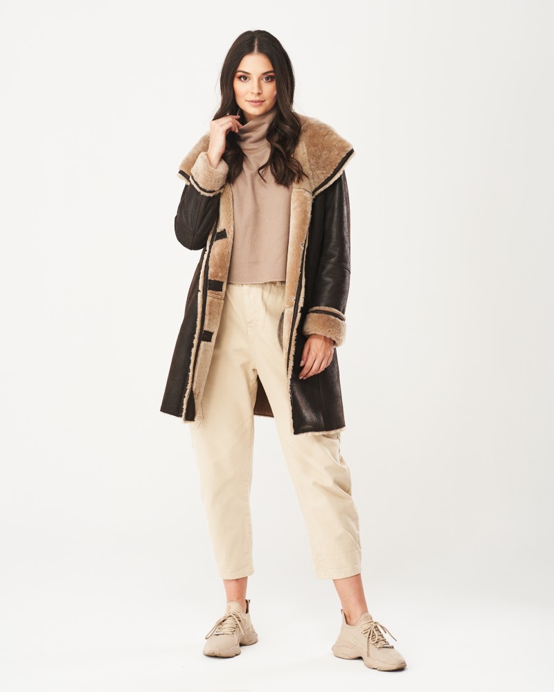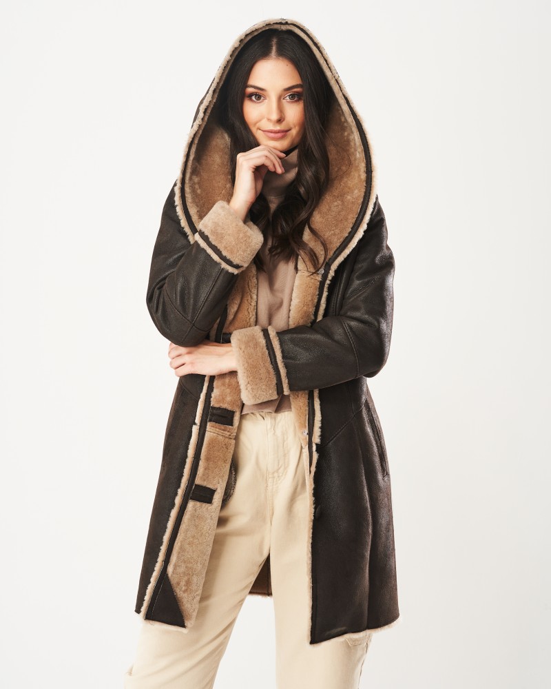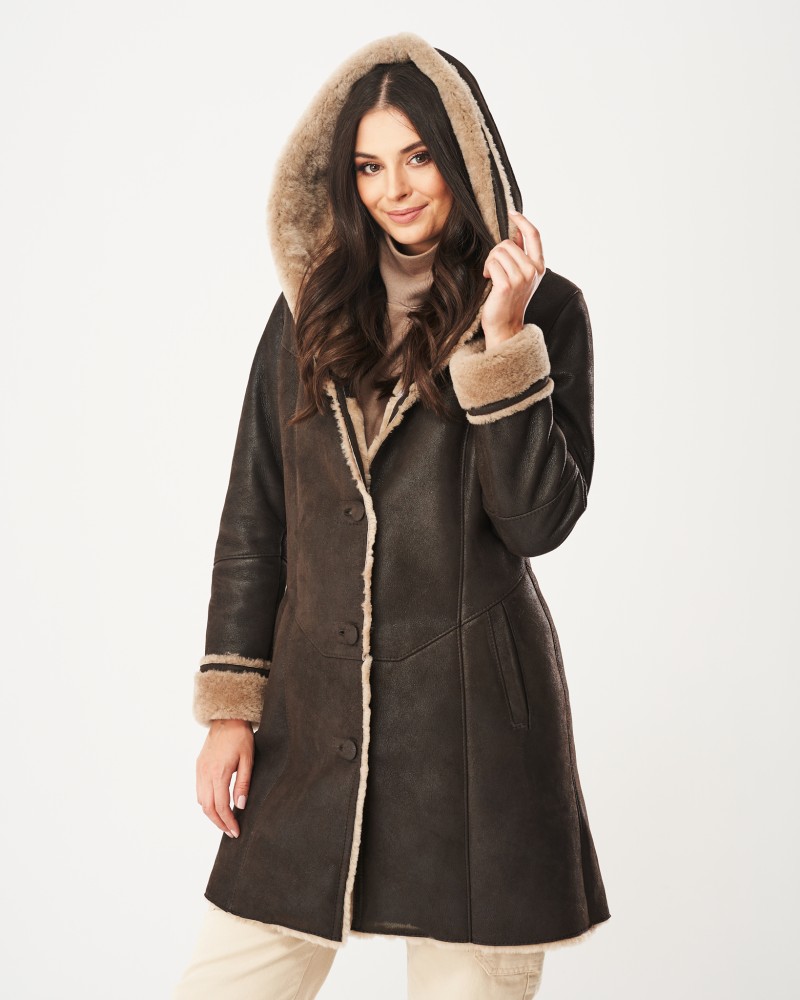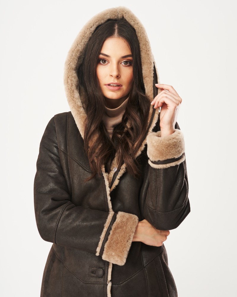 Dámsky kožuch Megan sa zapína na praktické, elegantné gombíky a má nádhernú, priestrannú kapucňu, ktorá vytvára klasický, vykladaný golier, dodávajúci projektu jedinečný charakter. Celok dokonale dopĺňajú ozdobné zakončenia v podobe kožušinových vložiek nachádzajúcich sa na manžetách rukávov.