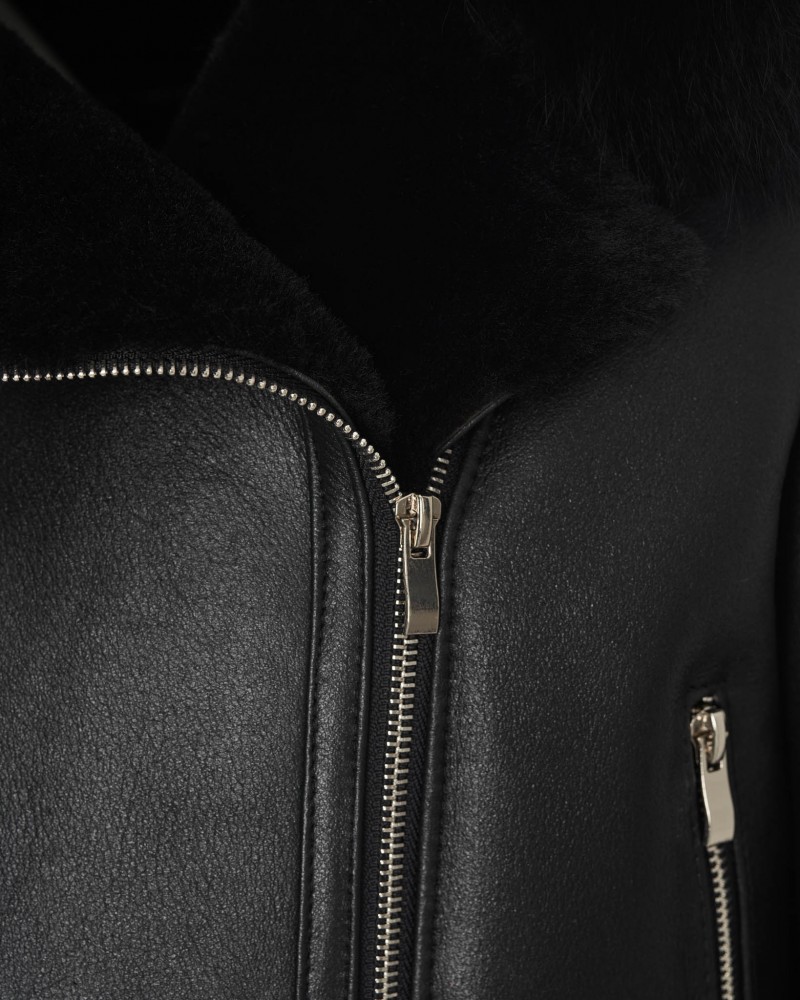Dámsky kožuch Elma bol strihnutý v štýle ramonesky a obsahuje všetky prvky charakteristické pre tento typ odevu. Na bokoch a na jednom z rukávov sa nachádzajú praktické a zároveň mimoriadne štýlové vrecká na zips. V spodnej časti modelu nájdeme pás s prackou, ktorý slúži na ľubovoľnú reguláciu obvodu, aby sa bunda ideálne prispôsobila postave. Celok pôsobí výnimočne, spájajúc teplo a funkčnosť s jedinečným, rockovým dizajnom.