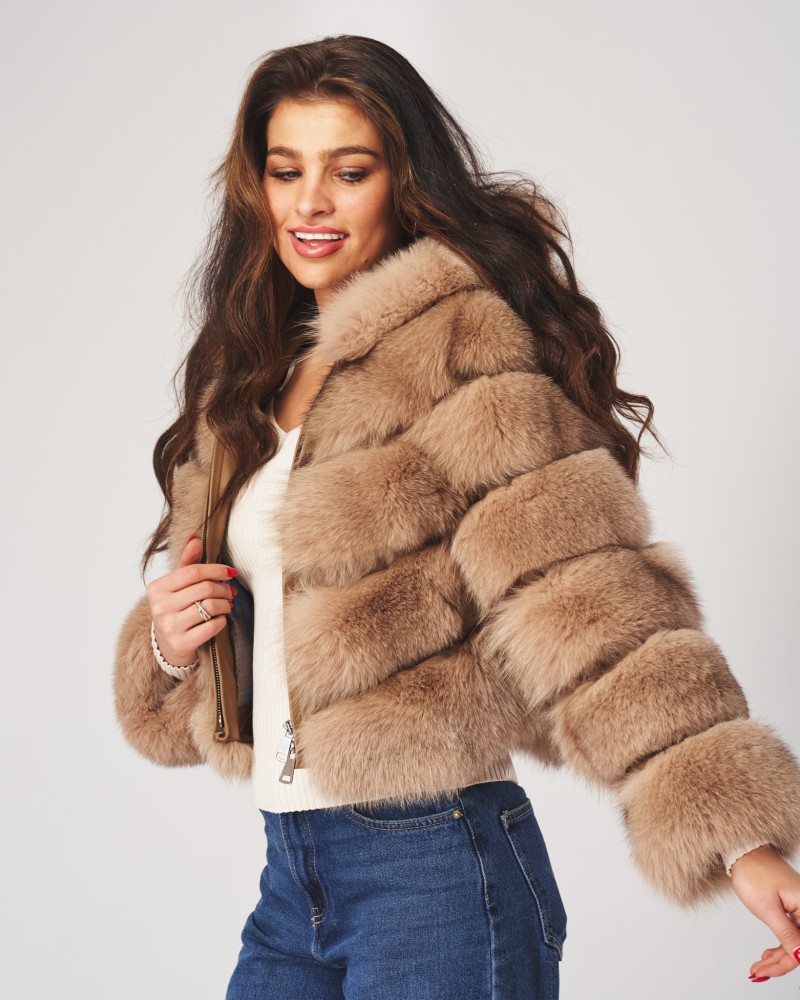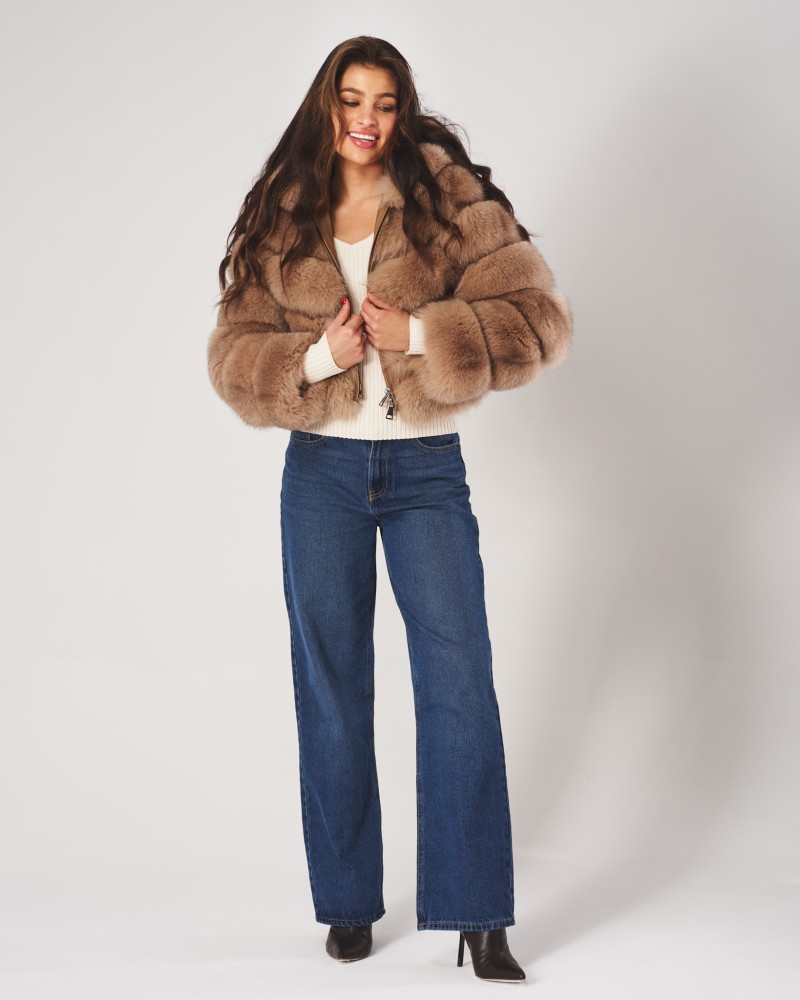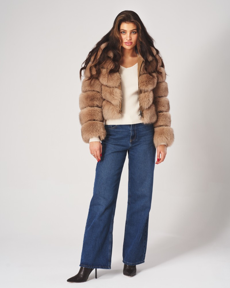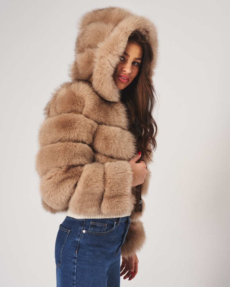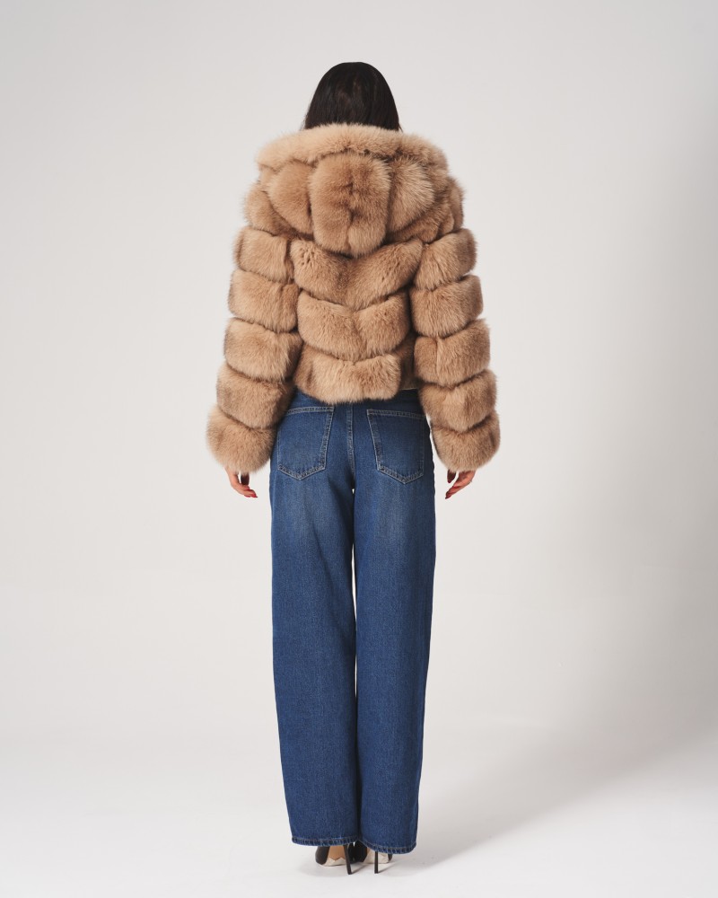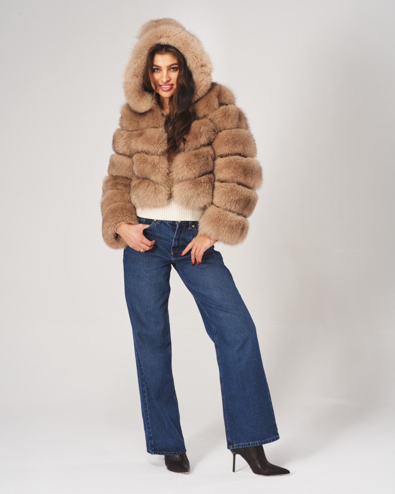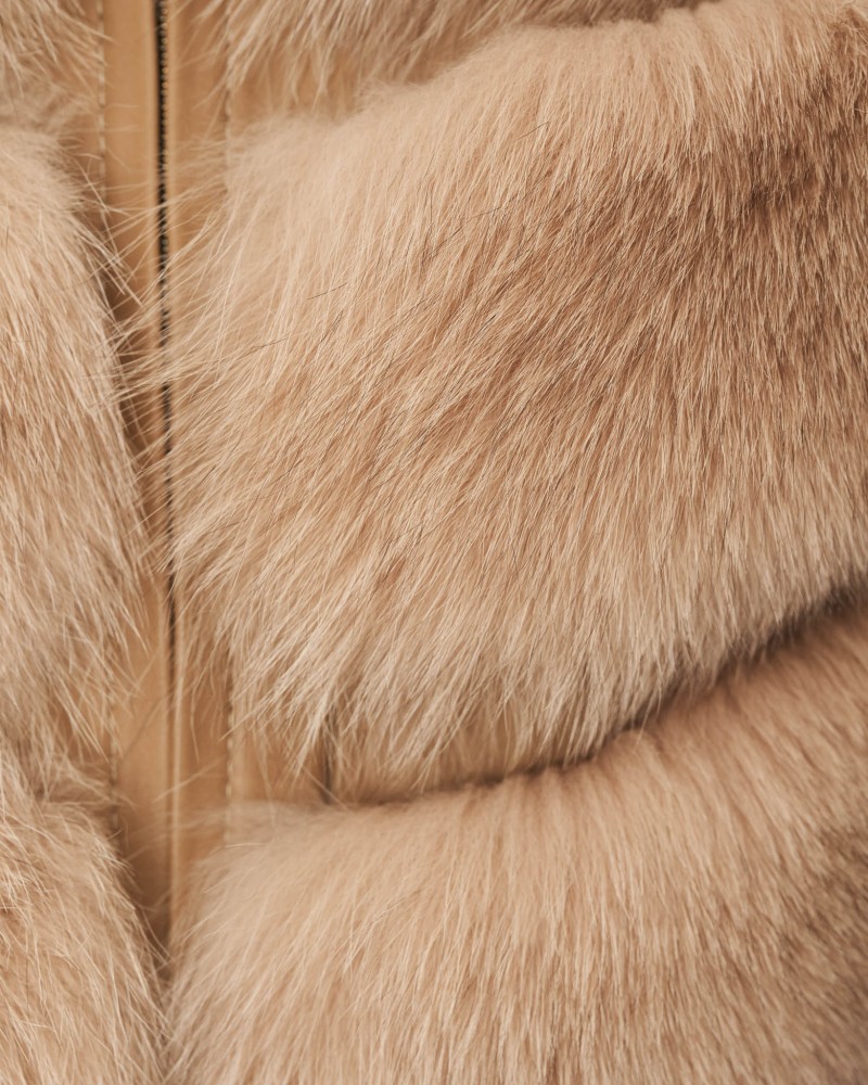 Kožušinová bunda dámska Enigma bola navrhnutá s dĺžkou siahajúcou po boky a voľný strih zabezpečuje voľnosť pohybu a pohodlie pri nosení. Priestranná kapucňa a pevný zips výborne chránia pred chladom, zaručujúc teplo počas chladnejších dní. Šikmo usporiadané pruhy z čiernej líščej kožušiny opticky zoštíhľujú postavu a dodávajú modelu jedinečný charakter. Praktické vrecká po bokoch sú ideálne na zahriatie rúk a malé rozparky po stranách pridávajú komfort pri nosení. Tento výnimočný model zabezpečuje štýlový vzhľad a zároveň dokonalú ochranu pred zimou.