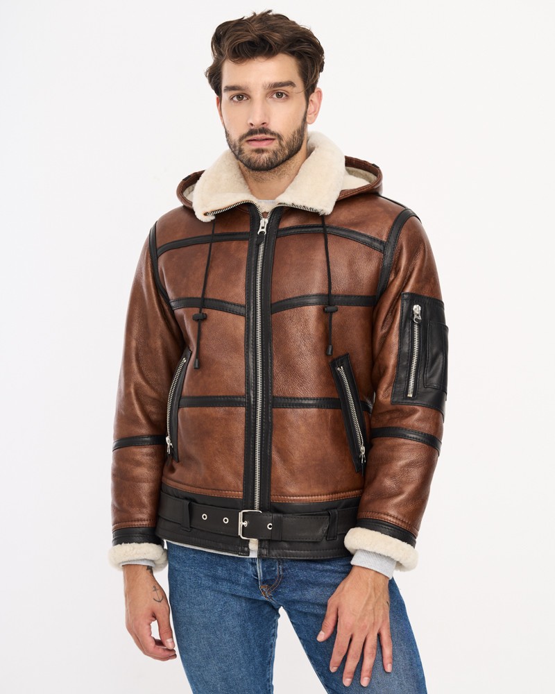Prírodný pánsky kožuch Stanley s kapucňou je ušitý v klasickom strihu pánskej bundy po boky, ktorá ponúka veľa voľnosti a slobody, neobmedzuje pohyb a zaručuje výnimočné teplo. Dokonale spracovaná ovčia koža v hnedom odtieni ideálne ladí s pevným, mužným charakterom odevu. Kožuch je po celej dĺžke zapínaný na odolný, nehrdzavejúci zips. Manžety a vyložený kožušinový golier majú kontrastnú, svetlú farbu vlny. Zapnutím zipsu až po vrch vznikne z goliera vysoký, mäkký a príjemný stojací golier, ktorý chráni krk pred stratou tepla. Kožuch je vybavený pohodlnou kapucňou so šnúrkami a stopermi, ktoré umožňujú lepšie prispôsobenie tvaru hlavy. Model zdobia početné vložky z lícovej jahňacej kože v tmavšom, hnedom odtieni. Spodok kožucha zdobí široký pás z tmavšej kože, doplnený o opasok s prackou, ktorý slúži na ideálne prispôsobenie šírky kožucha postave. Dve bočné vrecká a vrecko na rukáve sú zapínané na zipsy.